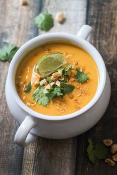 A carrot and coconut soup with honey, ginger, and cardamom-serves 6-8.